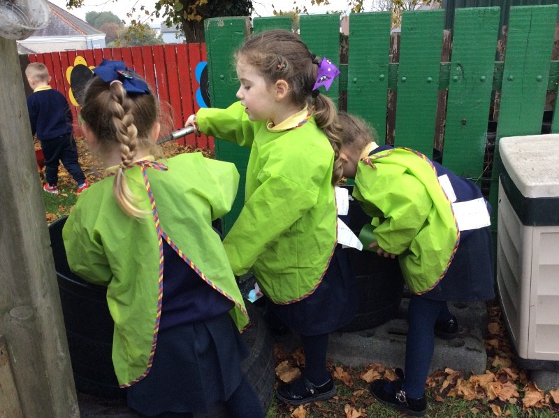 We have been very busy outside, exploring all the signs of autumn arriving - walking on the crunchy leaves, using the magnifiers to look at the different colours, shapes & sized leaves falling from the trees. We have been cutting the grass, gathering the autumn leaves and creating delicious dishes in the mud station.
